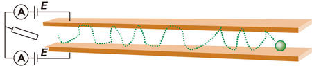 Bard のグループが電気化学1 分子計測を報告していたが1),依然として電気化学1 分子計測は困難な課題であった。一方,近年では図のように2 つの電極が100nm 程度の距離で配置されているナノギャップ(ナノ流路)電極デバイスが,電流シグナル増幅に基づく1 分子計測法として開発されている2, 3)。このデバイスは犠牲層エッチングで作製する。犠牲層エッチングとは2 つの層に挟まれた異なる材料を選択的に取り除く技術であり,2 つの層を機械的に分離できる。このデバイス作製では,作用電極,クロム犠牲層,作用電極,絶縁層を積層させた後,クロム犠牲層をエッチングで取り除くことで,クロム層の厚さと同じ高さのナノ流路を作製できる。この手法では通常のリソグラフィー技術のみを用いており,複雑な装置や技術を必要とせずに簡単にデバイスを作製できる。この近接した2つの電極に,それぞれ適切な電圧を印加することで,目的物質がそれぞれの電極上で,酸化と還元反応が繰り返し誘起される(レドックスサイクリング)。これにより得られる電流値が増幅され,1分子を電気化学的に計測できる。さらにレドックスサイクリングの特性を生かし,選択的なドーパミン検出が行われている4)。