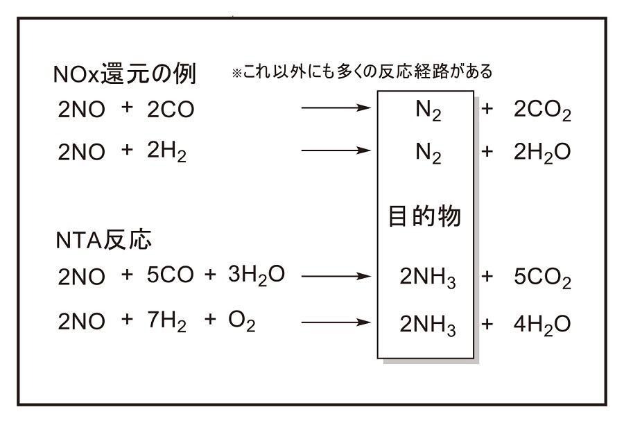 これに対して,NOxをN2以外の分子へ触媒的に変換する研究が注目されている。例えば窒素酸化物からアンモニアへの変換反応(NOx to Ammonia(NTA)反応)は(図),1990年代からPt系の触媒によって進むことが報告されてきた1)。当時はN2への還元の中間体としての観測だったが,今はNH3を作ることに焦点が合っており2),Pd,Fe,Cuなどの担持触媒でも反応が促進されることが報告されている。「N」を工業的に有用なNH3として再利用することを考慮すると,N2への還元とは異なり強固な三重結合を復活させないため,窒素の循環利用に有用であると考えられる。