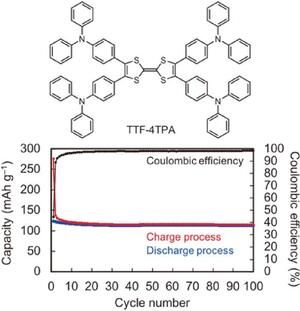 筆者らは,周辺部にアリール基を有するTTF類を合成し,その構造や性質の解明に取り組んでいる。その中で,最近,トリフェニルアミン(TPA)部位を有するTTF類縁体(TTF-4TPA)が,充放電プロセス中に電池内で重合し,サイクル特性を大幅に改善できることを見いだした。