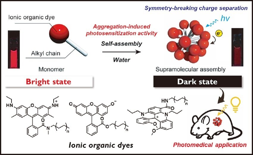 筆者らは,イオン性有機色素分子の集積により生じる光誘起対称性破壊型電荷分離(Symmetry-breaking charge separation; SB-CS)によって形成される電荷分離状態が,高いPDT活性につながることを見いだした2, 3)。さらに,この分子集合誘起SB-CSをレドックス活性なイオン性有機色素に適用することで,その集合体が細胞内部で持続的な酸化還元反応を引き起こし,腫瘍内部の低酸素環境下においても優れたPDT効果を示すことを明らかにした4)。本手法は,免疫系に作用する治療戦略とも親和性が高く,分子集合が創発する励起状態はPDTを「生体応答を引き出す医療」へと進化させる新たな基盤となることが期待される。