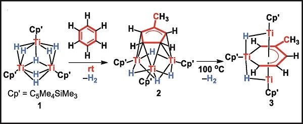 In our recent studies on multinuclear rare-earth and transition metal hydride complexes,1 we found that a trinuclear titanium heptahydride complex (1) could break and partially hydrogenate N2 at ambient temperature and pressure.2 When this Titanium hydride cluster was allowed to react with benzene, the carbon-carbon bond cleavage and rearrangement of benzene took place at room temperature, quantitatively yielding a ring-contraction product [MeC5H4] (2).3 In this transformation, a robust C−C bond of benzene is cleaved, together with formation of a new C−C bond. Upon heating at 100 °C, a Ti atom was inserted into a C-C bond of the MeC5H4 ring in 2 to give a titanacycle product (3). Other aromatic compounds such as toluene and pyridine could also be cleaved in a similar fashion. In all of these transformations, the cooperation of multiple titanium hydrides has played a critically important role. These studies may facilitate the design of new catalysts for the transformation and functionalization of inactive aromatics.