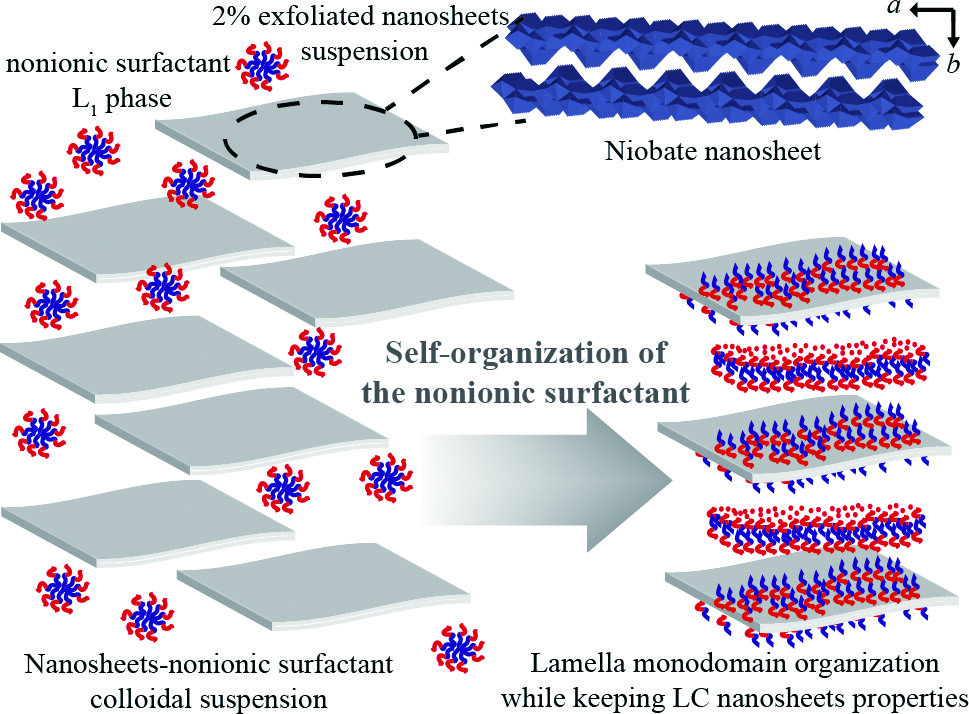 Two dimensional(2D)atomic crystals or nanosheets resulting from the exfoliation of individual atomic planes peeled from inorganic layered materials constitute nano materials with fascinating properties and diverse potential applications for constructing novel nanomaterials1, 2). At the crosspoint of both hybrid materials and physical chemistry science, a recent study on the mixing of these materials with membrane phases made by nonionic surfactants stressed out the importance of the 2D geometry of nanosheets as a template system to orientate and stabilize in a lamellar organization the surfactant spherical micelles3).