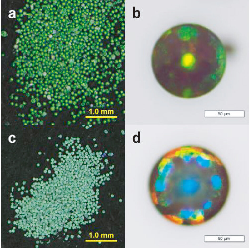We can control the geometrical shape of photonic crystals consisting of colloidal particles, and can produce spherical photonic crystals 1) -4). This spherical photonic crystal is called a photonic ball, and exhibits an optical phenomenon depending on the particle size of the colloidal particles. The right figure shows macroscopic and microscopic color development of a photonic ball formed from silica colloidal particles of 250 nm (a, b) and 400 nm (c, d) in particle diameter. Both systems appear macroscopically green, but microscopically exhibit quite different structural color properties. It has been found that the color produced by photonic balls consisting of 250 nm colloidal particles can be explained by Bragg reflection. On the other hand, only the grating diffraction or the Bragg reflection has been considered separately in the previous researches for the explanation of the iridescent coloring phenomenon as seen from the photonic ball consisting of 400 nm colloidal particles.