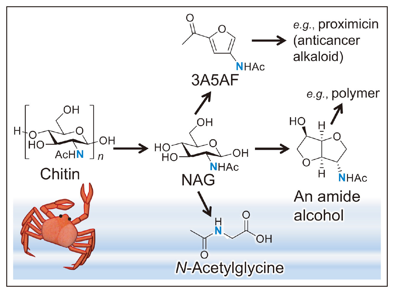 Chitin, a polymer of N-acetylglucosamine (NAG) linked by b-1,4-glycosidic bonds, is a prominent marine biomass. The characteristics of chitin, made almost entirely of repeating nitrogen-containing units, has recently attracted the attention of researches in the field of green chemistry who seek an alternative resource for producing organic nitrogen compounds1).