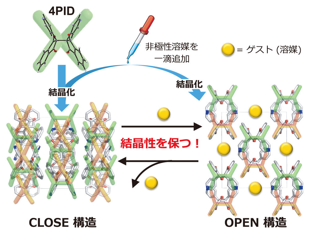 Recently we reported high potential of 4-pyridyl-1,3-indanedione dimer (4PID) as a functional crystalline host material to give two specific packing structures, tightly packed "CLOSE" and solvent-included "OPEN" forms, selectively (Figure). The structural selectivity from "CLOSE" to "OPEN" crystal is easily switched by simple addition of a drop of various kinds of less-polar solvent in the crystallization condition. Interestingly, thermal removal of the solvent molecules from "OPEN" crystal affords a densely-packed "CLOSE" crystal via dynamic structure transformation without any crystallinity loss. Whereas, dipping "CLOSE" crystal in a specific solvent afforded again "OPEN" crystal without getting dissolved. Indanediones are known to show hemolysis/rejoin of the central C-C bond by outer stimuli. Further investigation applying such dynamic C-C bond together with the host-guest property of 4PID is highly attractive.