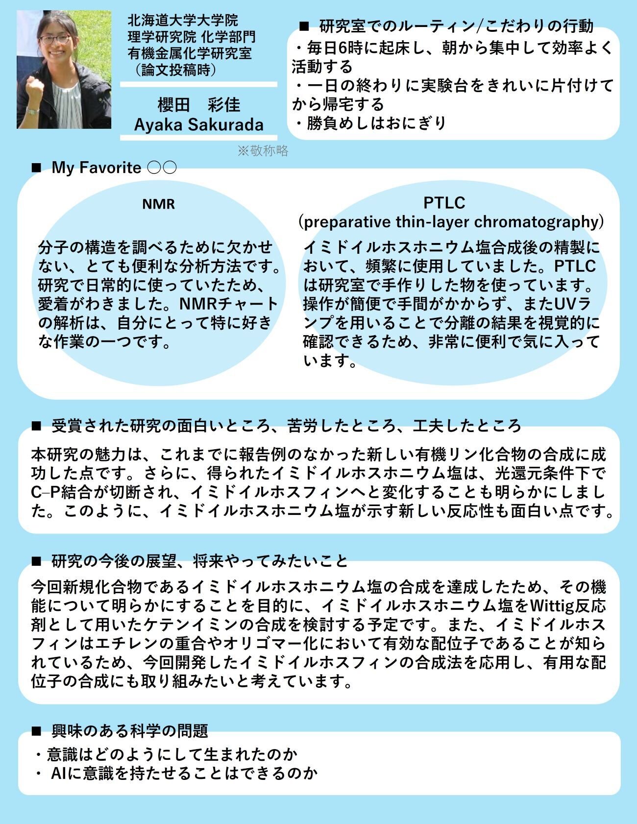 当会ジャーナルの受賞論文やジャーナル賞に主に携わった若手研究者に記事のご執筆をお願いしております。ご執筆者のご紹介、そして同じ化学分野でご活躍の方々向けのメッセージとして掲載を行っています。