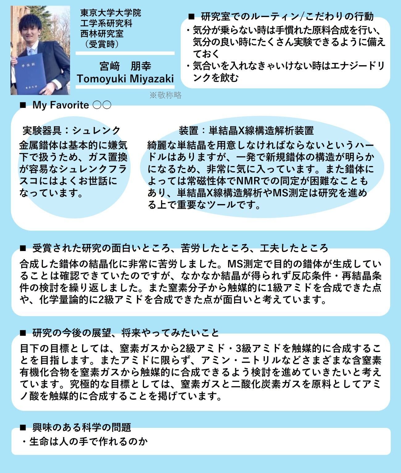 当会ジャーナルの受賞論文やジャーナル賞に主に携わった若手研究者に記事のご執筆をお願いしております。ご執筆者のご紹介、そして同じ化学分野でご活躍の方々向けのメッセージとして掲載を行っています。