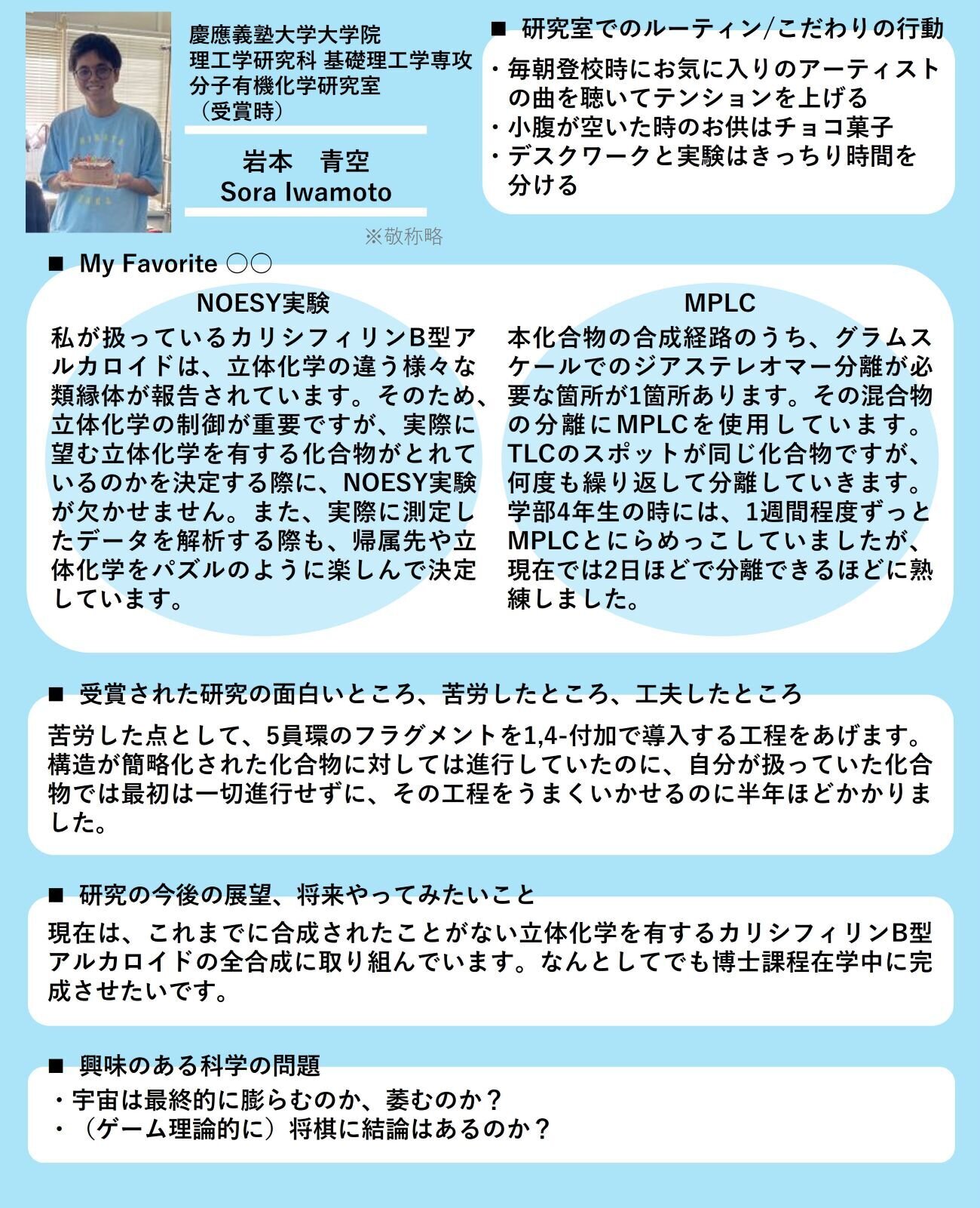 第48回目は、以下2つの会でのジャーナル賞のご受賞者です。・第51回複素環化学討論会(2022) BCSJ Award・第67回天然有機化合物討論会(2025) Chemistry Letters Young Researcher Award