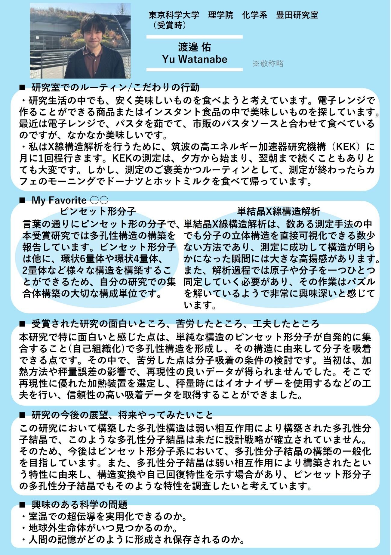 当会ジャーナルの受賞論文やジャーナル賞に主に携わった若手研究者に記事のご執筆をお願いしております。ご執筆者のご紹介、そして同じ化学分野でご活躍の方々向けのメッセージとして掲載を行っています。