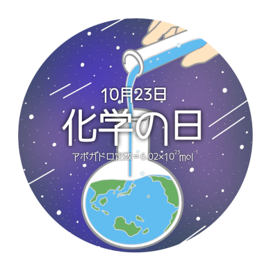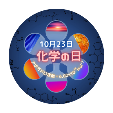 日本化学会、化学工学会、新化学技術推進協会、日本化学工業協会の4団体の共同提案で、10月23日を「化学の日」、10月23日を含む週(月曜日~日曜日)を「化学週間」と制定しています。アメリカでも昔から「Mole Day」として親しまれており、「アボガドロ定数:1molの物質中に存在する粒子の数=6.02×10の23乗」に由来しています。化学や化学産業が社会生活に大きく貢献していることをみなさんに知っていただき、化学を盛り上げていくことを目的としています。