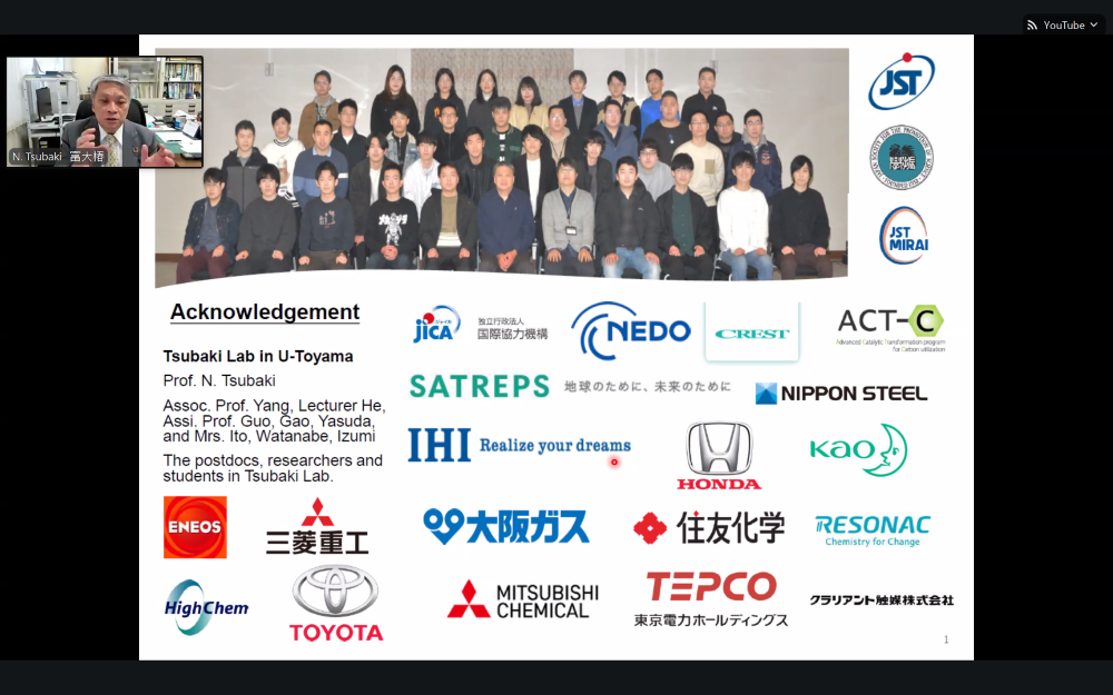 最初に、富山大学工学系の椿範立教授より、CO2やCOなどの炭素数一個の化合物を原料としてアルコールや芳香族、オレフィン、ガソリンなどの有用な化学品を合成するC1化学についてご紹介いただいた。具体的には、合成ガスを原料にして、コア-シェル構造を有するカプセル触媒等の触媒反応により、一段階でエタノールやパラキシレン等を合成するという内容である。この技術を活用したカーボンニュートラルタイヤの実現や、実証プラントの建設が行われていることについてご紹介があり、選択的に目的の化合物を合成することの課題と今後の展望についても伺った。