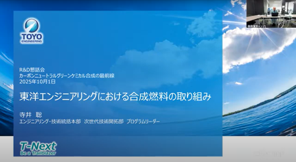 続いて、素材・エネルギー系プラントや産業・インフラ設備の事業を行っている東洋エンジニアリング株式会社の寺井聡氏から、CO2を原料とする同社独自のメタノール合成技術「g-Methanol」と、同社と米国の航空燃料会社Velocysとの提携技術であり、COとH2から主に直鎖の炭化水素を生成するFT(フィッシャー・トロプシュ)合成の実証化研究についてご講演いただいた。社会実装に向けてサプライチェーンや社会システムの構築が重要であり、そのためには国際的な協力が不可欠であるとのお話があった。
