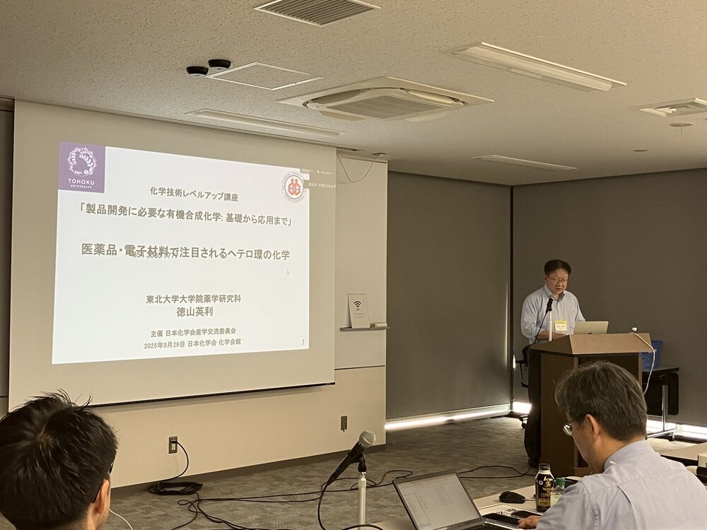 日本化学会産学交流委員会主催イベント、化学技術レベルアップ講座 製品開発に必要な有機合成化学:基礎から応用まで(現地開催)(主査:秋山隆彦(学習院大理))9月29日・30日の2日間、化学会館において開催され、企業の若手研究者を中心に17名の受講者が講義を熱心に聴講した。